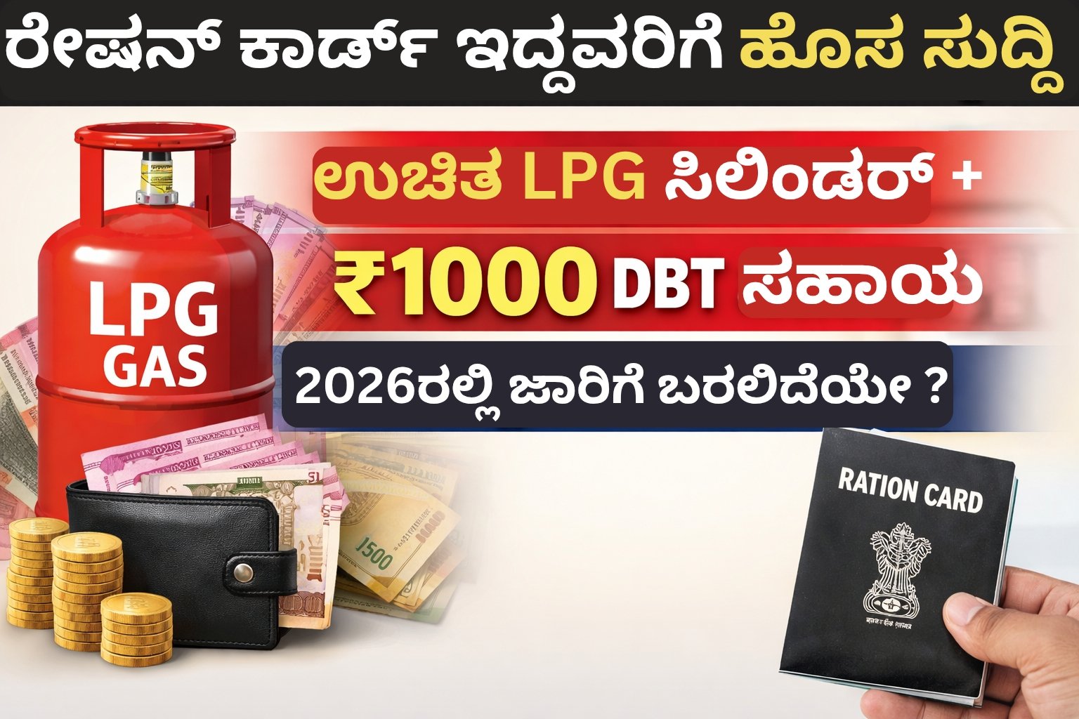 ಆರ್ಥಿಕ ಒತ್ತಡ ಹೆಚ್ಚುತ್ತಿರುವ ಈ ಸಮಯದಲ್ಲಿ ಪಡಿತರ ಚೀಟಿ ಹೊಂದಿರುವ ಕುಟುಂಬಗಳಿಗೆ ದೊಡ್ಡ ನೆರವು ಸಿಗುವ ಸಾಧ್ಯತೆ ಇದೆ. 2026ರಲ್ಲಿ ಜಾರಿಗೆ ಬರಬಹುದಾದ ಹೊಸ ಕಲ್ಯಾಣ ಉಪಕ್ರಮದಡಿ ಅರ್ಹ ಫಲಾನುಭವಿಗಳಿಗೆ ಉಚಿತ LPG ಗ್ಯಾಸ್ ಸಿಲಿಂಡರ್ ಮತ್ತು ₹1000 ನೇರ ಆರ್ಥಿಕ ಸಹಾಯ (DBT) ನೀಡುವ ಕುರಿತು ಮಾಹಿತಿ ಹೊರಬಿದ್ದಿದೆ.